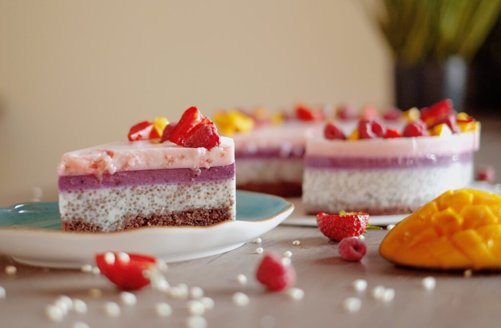 Quark, Mango, Eiweiß, 30% Sahne, Mascarpone, saisonale Früchte, Haferflocken, 1,5% Milch, Datteln, Agar-Agar, Erythrit.