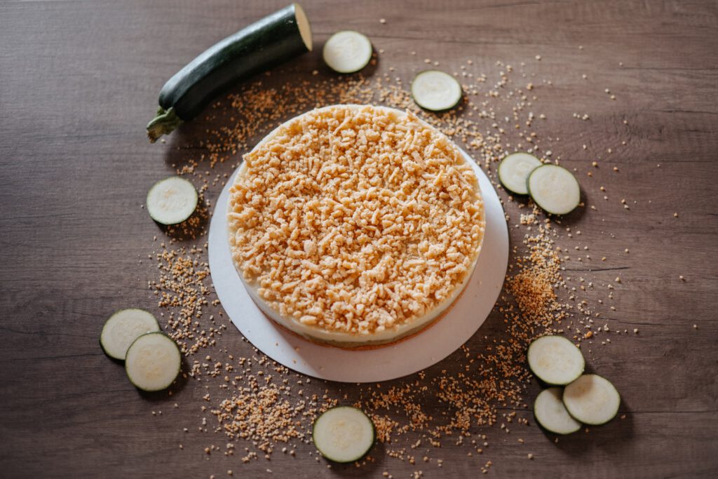 Zucchini, Kokosmehl, Mandelmehl, Kokosöl, Mandelmilch, Zitrone, glutenfreier Pudding*, Apfelessig, Zimt, Erythrit, Agar